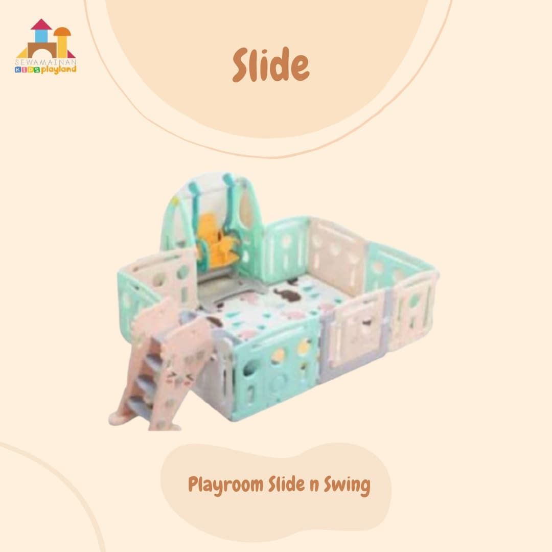 Playroom yang di lengkapi oleh ayunan dan perosotan yg di letakkan bersebrangan.