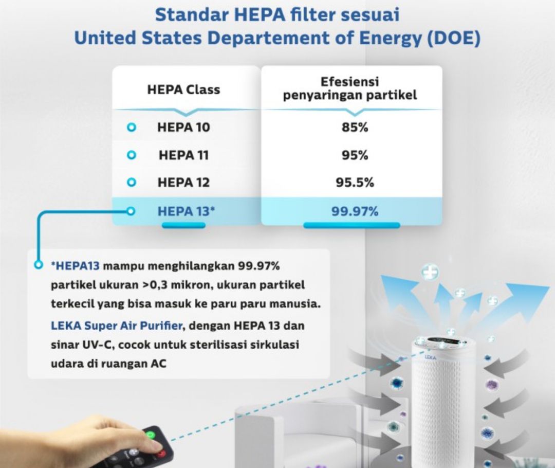 LEKA Air Purifier aja! Dilengkapi dengan sinar UV-C, sehingga alat tidak hanya menyaring, namun membunuh bakteri, kuman dan virus pada udara